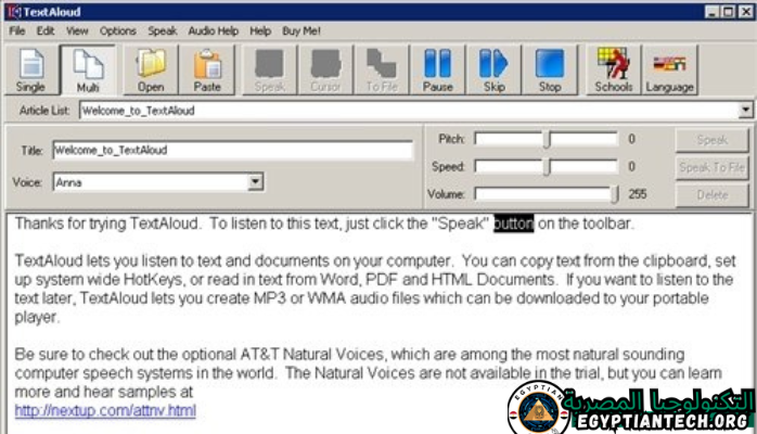 يدعم برنامج TextAloud تحديد ونسخ أي نص من أي مصدر لتحويله إلى ملف صوتي بسرعة كبيرة. يمكنك أيضًا استيراد ملفات نصية وملفات PDF وPowerPoint الواردة وتحويلها إلى ملف صوتي بنقرة واحدة. كما يتيح لك البرنامج تحويل النصوص إلى ملفات صوتية وتقسيمها إلى عدة أجزاء. يمكنك أيضًا تغيير مظهر واجهة المستخدم الرسومية إلى مجموعة واسعة من السمات الجذابة من خلال هذا البرنامج يمكنك حفظ القراءة الصوتية على جهاز الكمبيوتر الخاص بك على شكل ملف صوتي بامتداد MP3 وWMA. يتيح لك البرنامج التحكم في سرعة القراءة الصوتية ومستوى الصوت وأيضا ضبط نغمة الصوت، بالإضافة إلى إمكانية تغيير صوت القراءة إلى العديد من الأصوات الخاصة بالشركة. مايكروسوفت يوفر لك برنامج TextAloud شريط أدوات كامل مثبت على Microsoft Word لمساعدتك على قراءة جميع النصوص بصوت عالٍ مباشرة من داخل ملفات Word. كما يوفر لك أيضًا شريط أدوات لمتصفحات الإنترنت لقراءة النصوص بصوت عالٍ مباشرةً من صفحات موقع الويب.